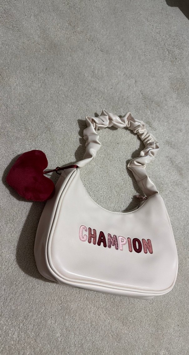 Krem deri çanta. "CHAMPION" baskılı ve parlak görünümlü, kırmızı kalp aksesuarı bulunur. Trendy sokak stili için uygun. ❤️