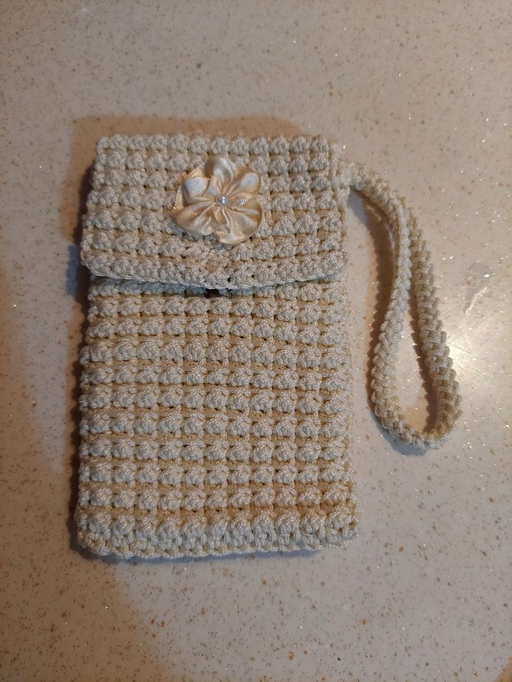 krem renkli, örgü dokulu ve çiçek detaylı kapaklı telefon çantası, bohem tarzını yansıtan rahat bir tasarıma sahiptir.