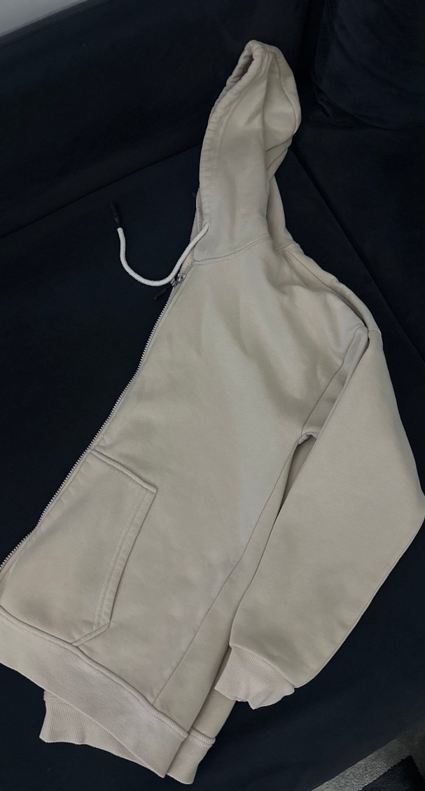 Krem kapüşonlu sweatshirt, fermuarlı, uzun kollu ve bol kesimdir. Yumuşak, sıcak kumaştan üretilmiştir, rahat sokak stili için uygundur. S-M beden