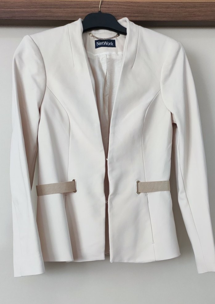 Krem renkli, kemer detaylı kadın blazer ceket. Notched lapel yakalı, uzun kollu ve kısa boyda.Soft kumaştan, ofis ve günlük şıklık için uygun.