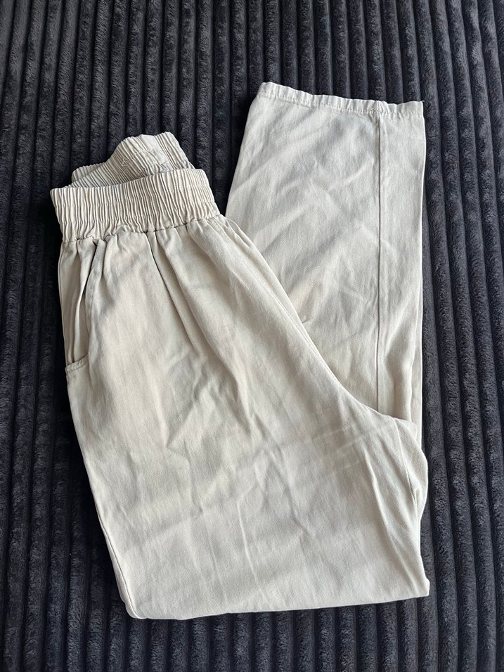 Krem keten kumaştan, bol kesim ve pilili tasarıma sahip midi boy kadın pantolon, sade ve günlük kullanım için uygundur.