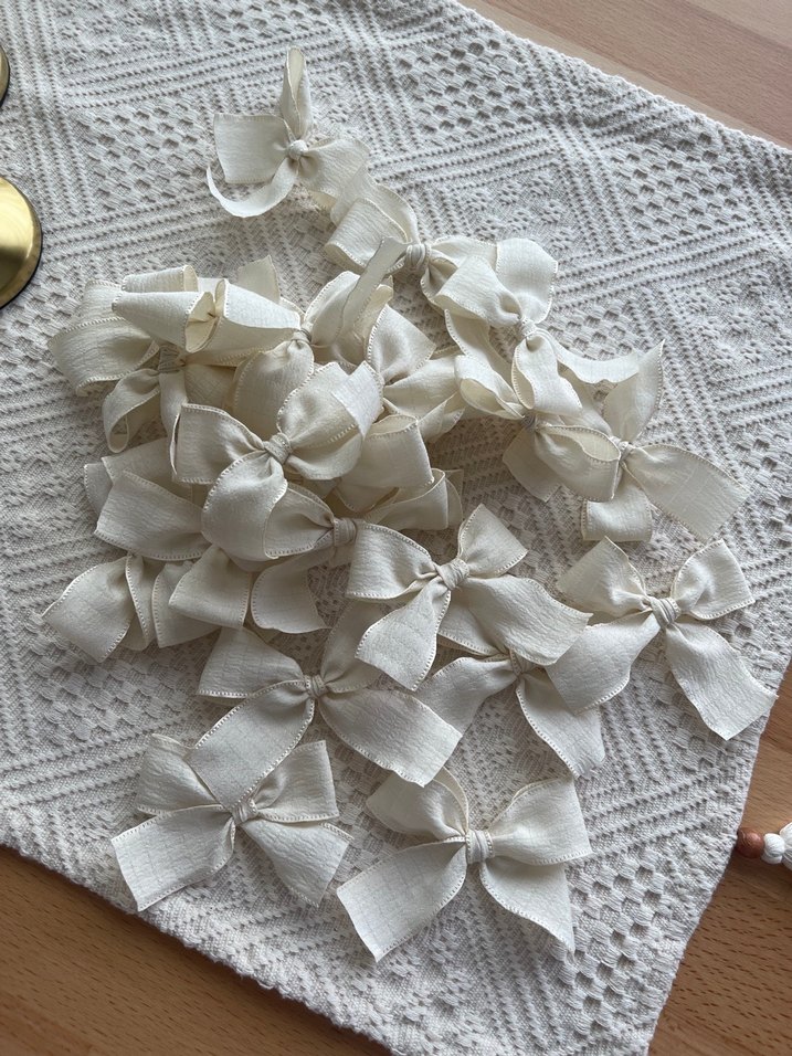 Beyaz keten kumaştan, hafif bohem tarzda sade ve şık saç fiyonkları. Süslemede kullanılabilir 25 adet