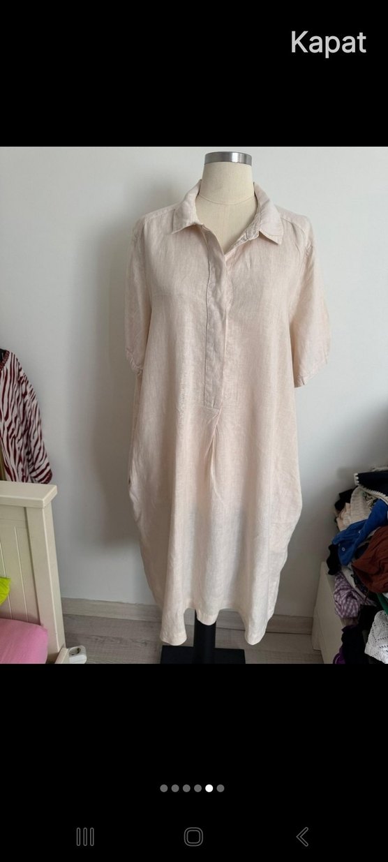 Keten kumaştan, kısa kollu, yakalı ve bol kesim midi elbise. Minimalist ve bohem tarzda, günlük kullanım için uygundur. 48 -50-52 bedene uygundur