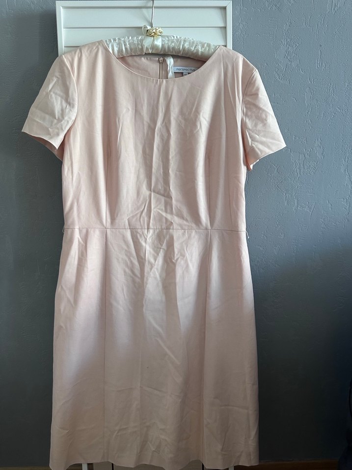 Krem rengi, yumuşak keten kumaştan midi boy, kısa kollu ve yuvarlak yakalı elbise. Düz, desensiz tasarımıyla ofis için rahat ve şık bir tercih.