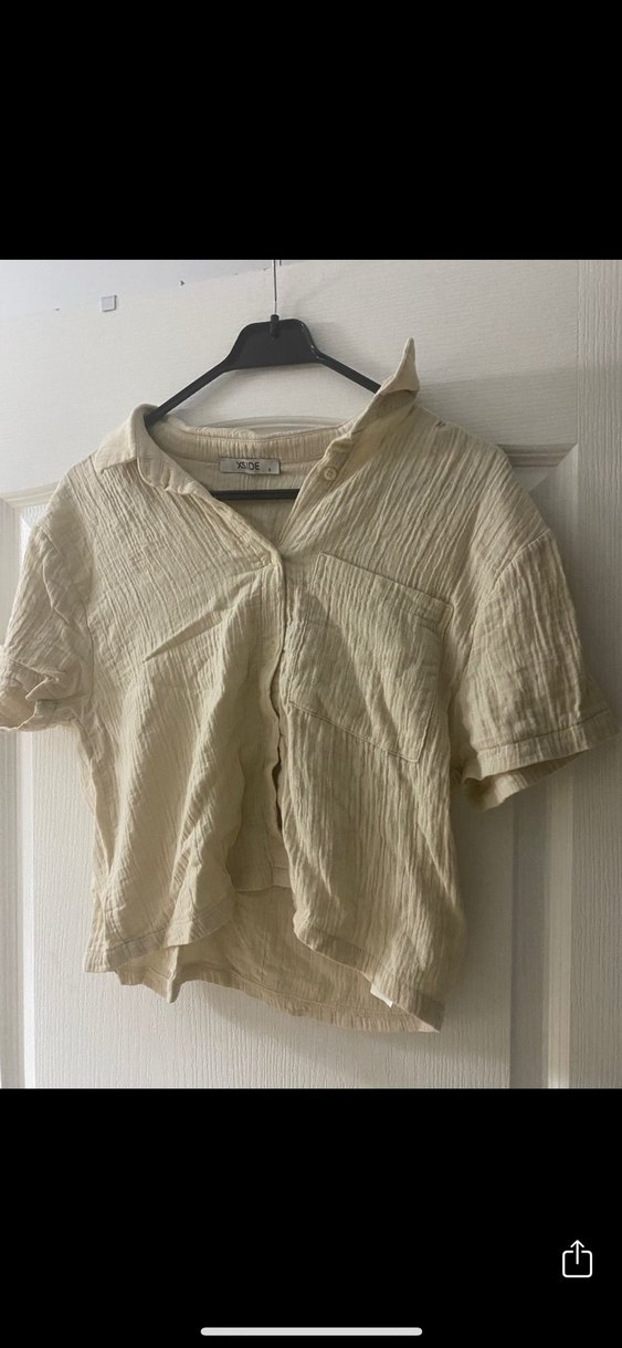 Krem renkli müslin kumaştan, kısa kollu ve düğmeli önü olan, bol kesim kısa boy gömlek. Minimalist tarzda, günlük rahat kullanıma uygun. Üst s alt l beden takımdır