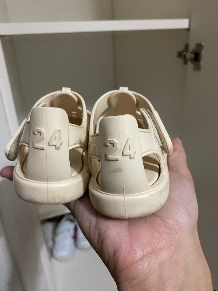 Krem renkte, cırtcırtlı bantlı kız çocuk terliği. Arkasında kabartmalı 24 sayısı bulunur. Dayanıklı kauçuk malzemeden üretilmiştir. İgor marka çok az kullanılmıştır