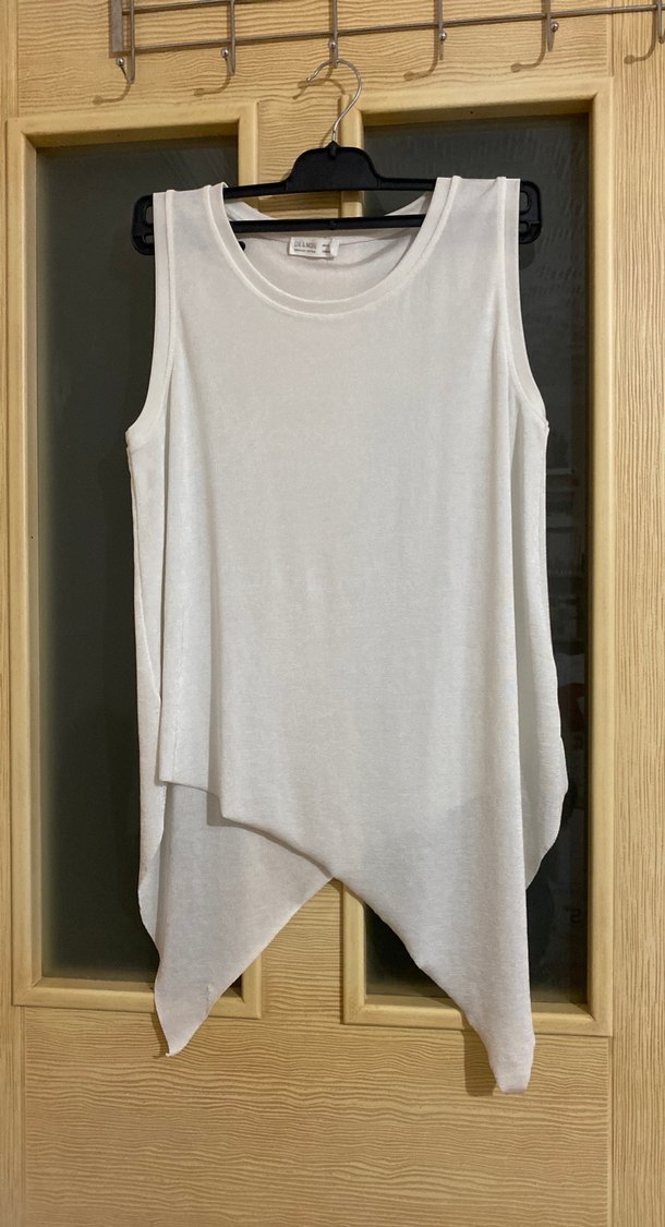 Krem, kolsuz ve bol kesimli bu bluz, asimetrik ve drapeli etek ucu ile yumuşak keten kumaştan yapılmıştır. Minimalist tasarımı günlük kullanıma uygundur. Göğüs 44cm , boy 66cm , kullanılmamıştır