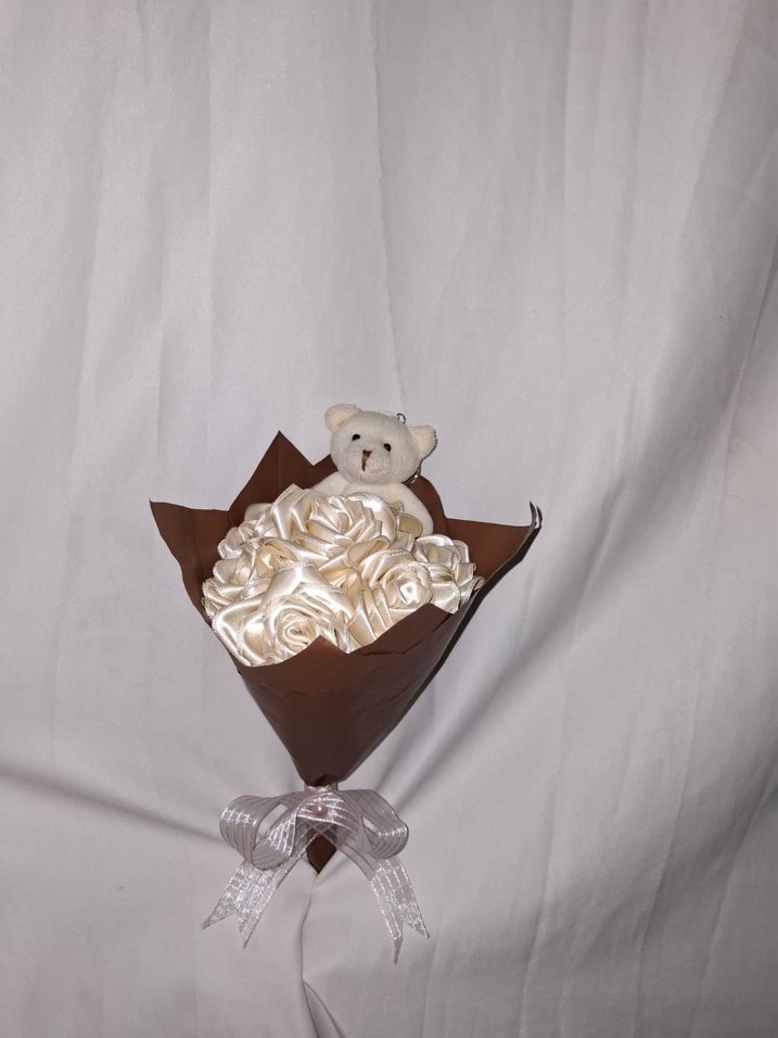 Kahve buket kağıdına sarılmış krem ayıcıklı, krem kurdele çiçek buketi. Sevdikleriniz için solmayacak bir buket. Sipariş alınır.