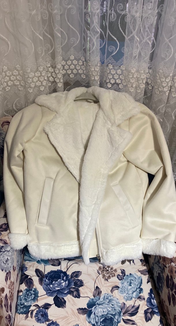Krem, kürklü detaylı, uzun kollu, notched lapel yaka ve bol kesim midi ceket. Yumuşak ve sıcak kumaştan, günlük kullanıma uygun.