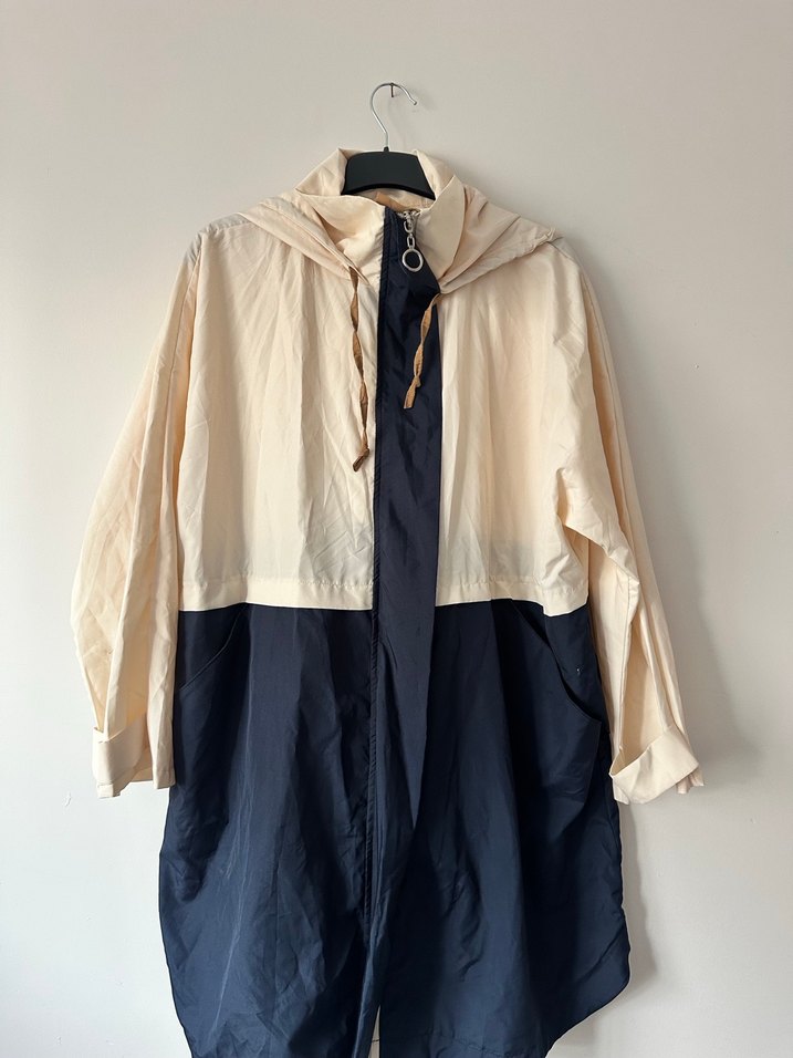 Kadın yağmurluğu, bol kesim, uzun kollu ve yakalıdır. Krem ve lacivert renklerde, dökümlü tasarıma sahip, günlük kullanıma uygundur. Sentetik kumaştan üretilmiş. Su geçirmez