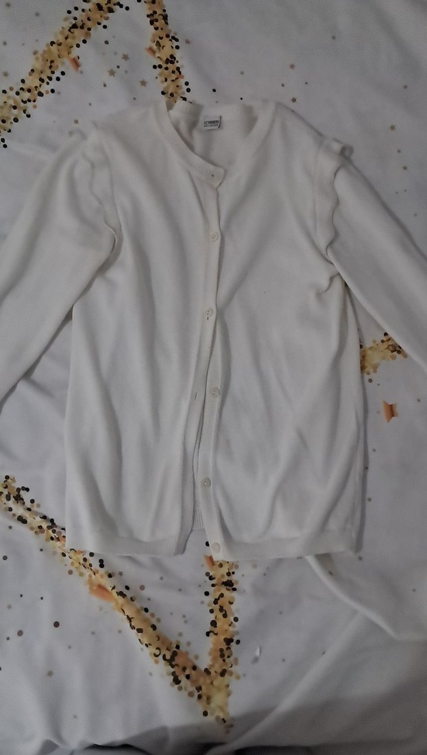krem düğmeli hırka omuzlarında fırfır var ve fırfırları gri simli biraz lekesi var küçük sarı kalem lekesli