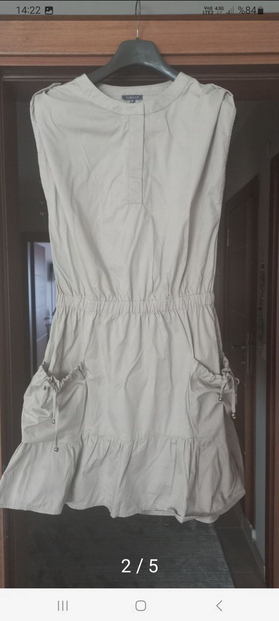 krem renkli, kemerli ve cepli midi boy, askısız, bol kesim elbise. Yumuşak sentetik kumaştan, günlük dış mekan kullanımı için uygun.