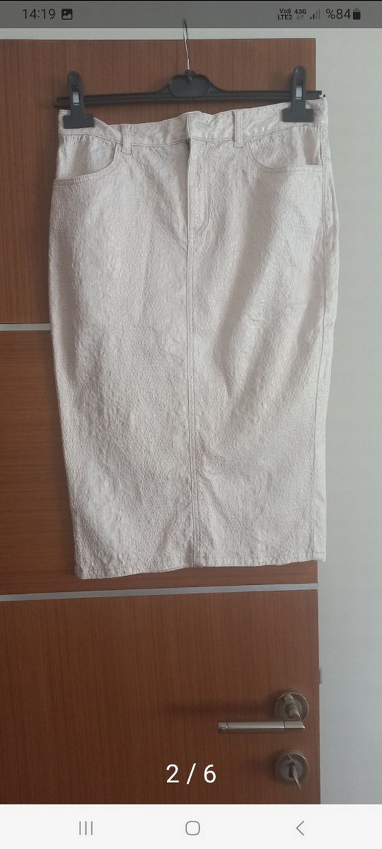 kremketen kumaştan yapılmış, midi uzunlukta ve regular fit etek ve minimalist bohem tarzda, günlük kullanıma uygun.