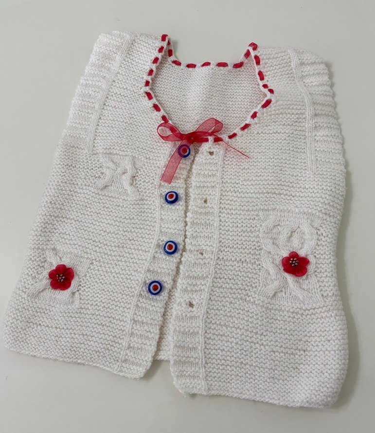 Krem rengi, örgü detaylı bebek hırka. El örgüsüdür.