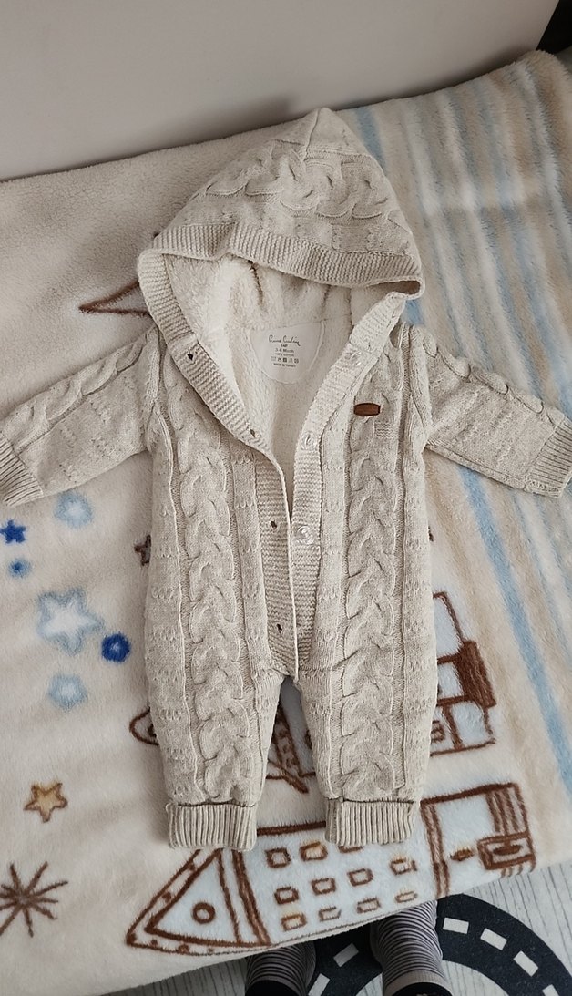 Kapüşonlu, beyaz örgü bebek tulumu, nakış detaylı ve yumuşak, sıcak tutan kumaştan yapılmıştır. kolları hariç içi polarlı birkaç kez kullanilmıştır. ❄️