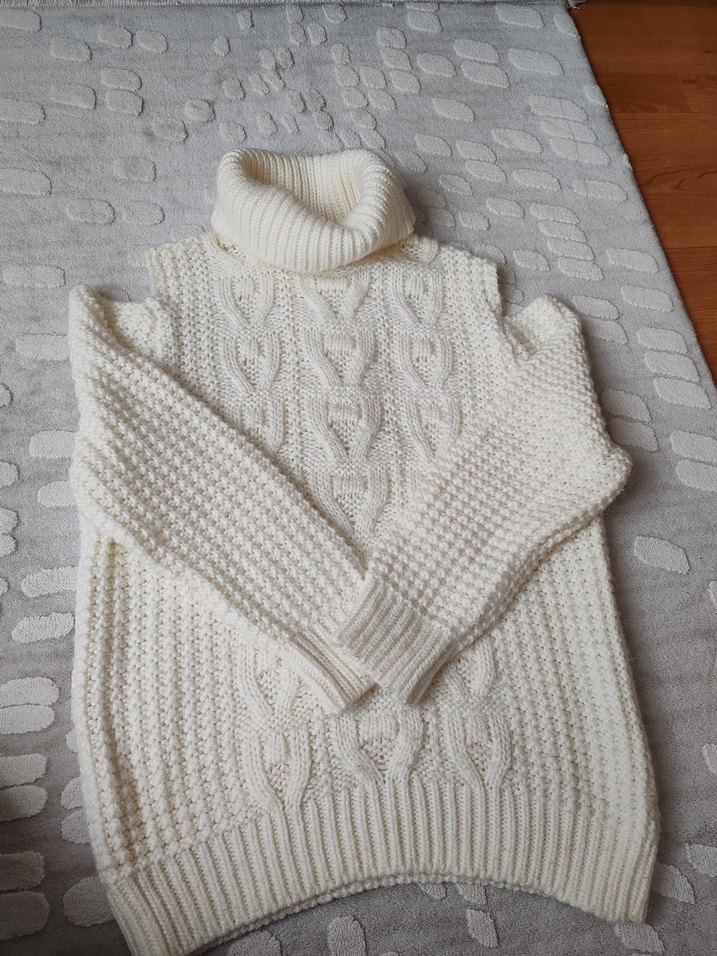 Krem örgü kadın kazak, boğazlı ve uzun kollu, bol kesimdir. Günlük kullanıma uygun sade ve rahat bir tarza sahiptir.