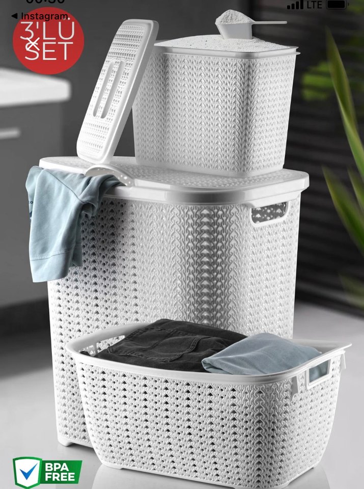 Beyaz renkli, örgü desenli ve taşıma kulplu saklama sepetidir. BPA içermez, çamaşır ve ev eşyaları için uygundur. Bende ki rengi krem rengidir isteyene detaylı fotoğraf atabilirim