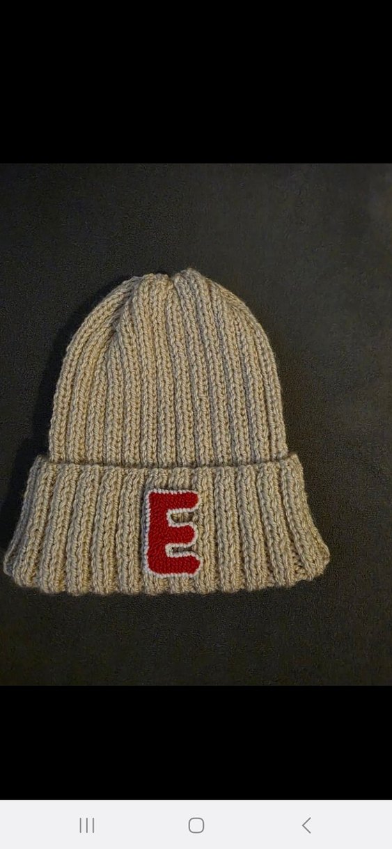 krem örgü kadın bere, manşetinde kırmızı 'E' nakışıyla rahat ve şık bir sokak stili ürünü.kişiye özel istenilen harflerde yapılmaktadır
