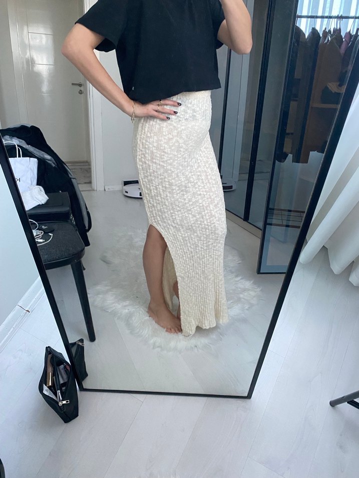 Krem örgü kumaştan yapılmış, bol kesim ve yırtmaçlı uzun etek. Desensiz, rahat tasarımı günlük kullanıma uygun bohem tarzda.