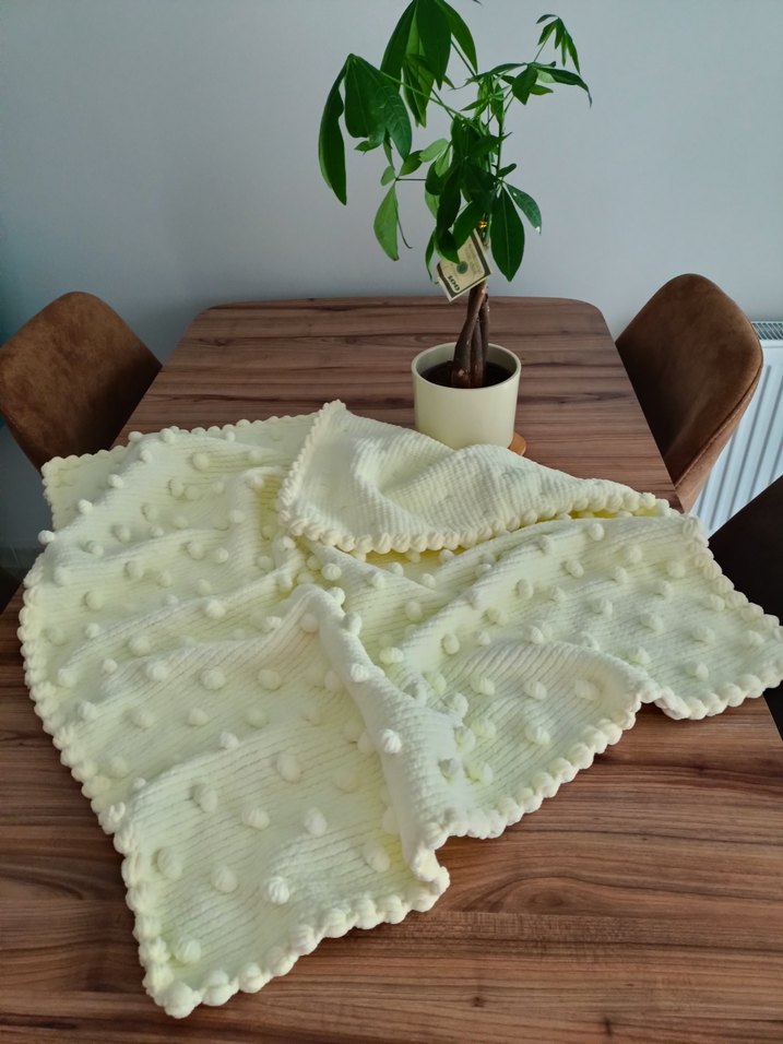 Kadife ip ile örülmüştür. Kabarcık desenli ve dalgalı kenarlara sahip, yumuşak ve rahat.