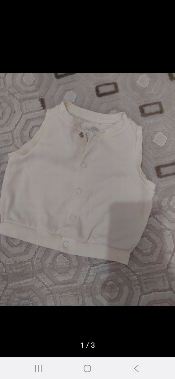 Pamuklu kumaştan, krem rengi ve salaş kesim bebek yeleği. Bisiklet yaka ve koltuksuz tasarımıyla sokak stiline uygundur.