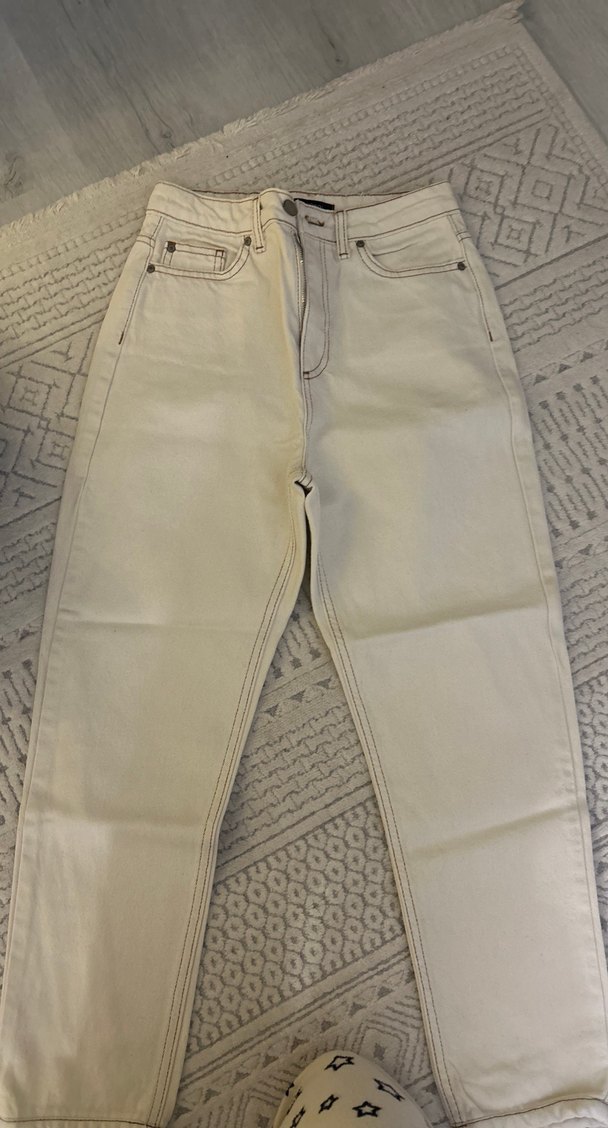 Bej renkli, regular fit kadın kot pantolon, yumuşak pamuktan üretilmiştir. Midi boy ve desensiz tasarımıyla günlük rahat sokak stili için uygundur.