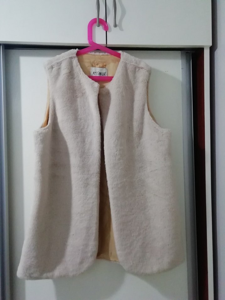 Kolsuz, krem peluş detaylı, normal kesim ve yuvarlak yakalı midi uzunlukta yelek. Rahat ve şık bir . ❄️