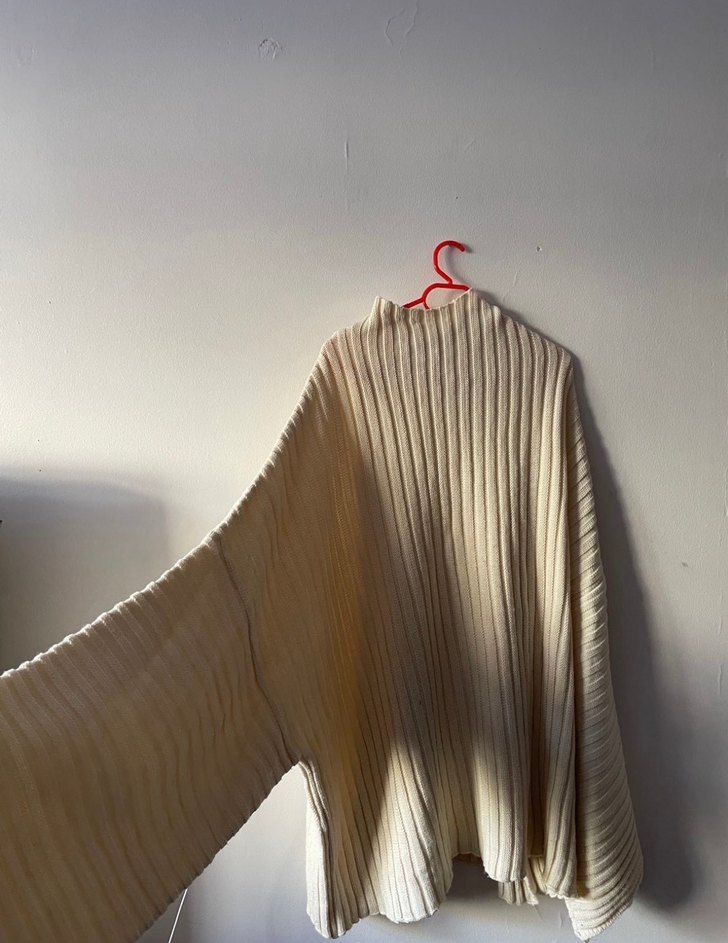 İkili fiyatıdır. Pantolonun paçalarında lekeler vardır ona göre alın lütfen Bej renk keten kumaştan, yüksek yakalı, pliseli ve bol kesim kadın kazak. Uzun kollu, oversize günlük kullanıma uygun tarzda.