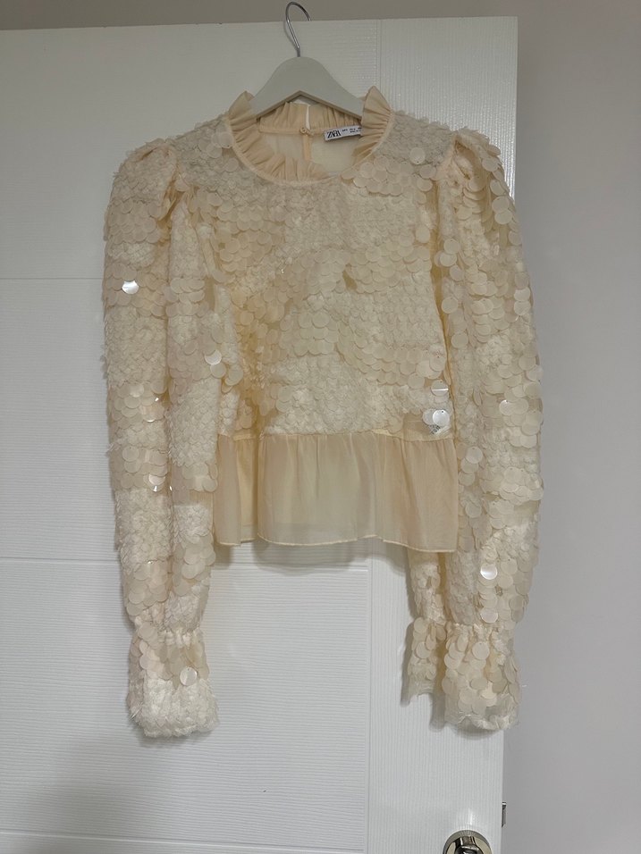 Krem renkli, pullu ve fırfırlı detaylara sahip, uzun kollu, salaş kesim kadın bluz. Yuvarlak yakalı, kısa boylu, düğün için uygun.
