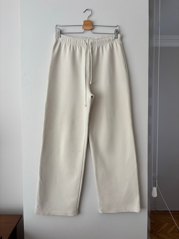 Krem renkte, yumuşak kumaştan yapılmış, rahat kesim kadın pantolon. desen içermeyen minimalist tasarımıyla günlük kullanıma uygundur.