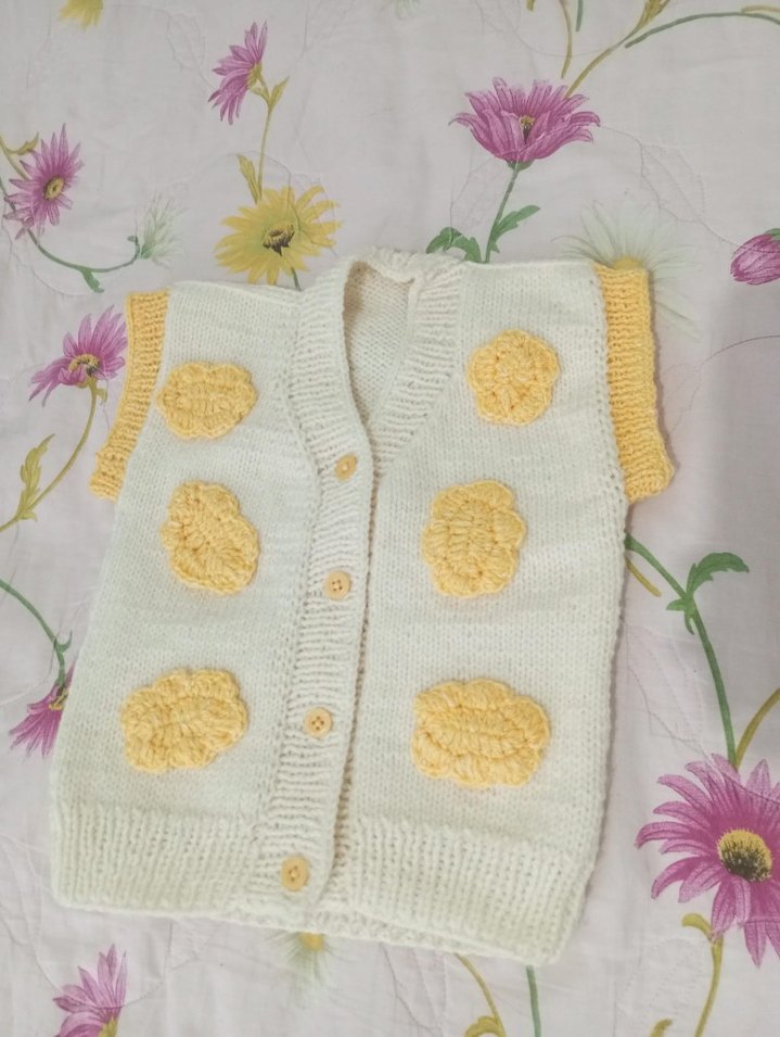 krem renkli sarı nakışlı hırka hiç kullanılmadı el örgüsü hırkanın boyu 40 cm eni 30 cm