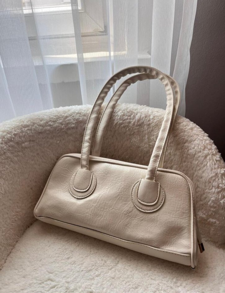 Krem rengi kadın çanta, yumuşak sapları ve pastel tonu ile minimal ve klasik tarzı yansıtıyor. Günlük kullanıma uygun modern bir modeldir.