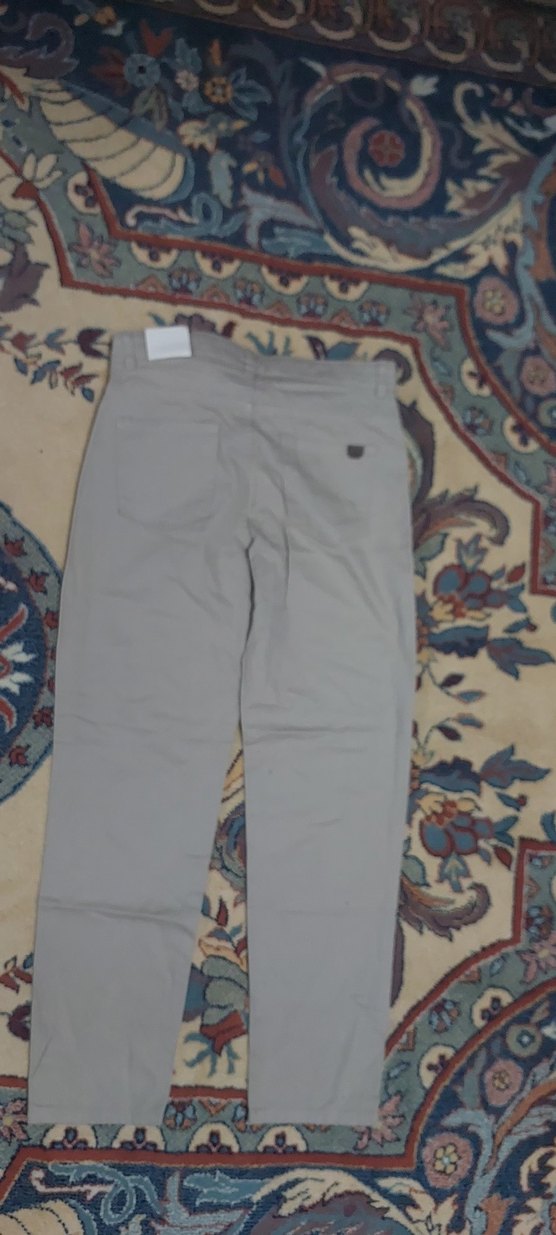 beji renkte, düğmeli ve normal kesime sahip erkek pantolonu. Pürüzsüz sentetik kumaştan, günlük ve sokak tarzına uygun. okul için kullanılabilir