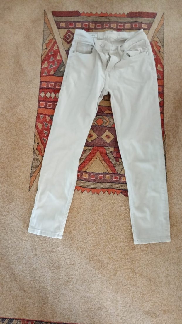Krem rengi, kemerli ve normal boyda erkek kot pantolon. Sorunsuzdur, az giyilmiş ve yeniden farksız.