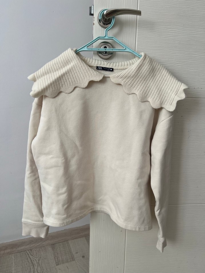 Krem rengi, fırfırlı yakalı ve uzun kollu kadın kazak. Yumuşak ve sıcak kumaştan, normal boyda ve vücuda oturan kesim.