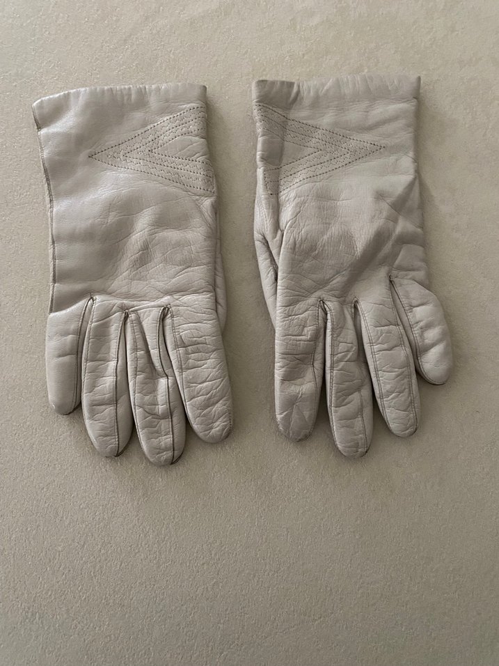Çok iyi durumda, temiz kullanılmış. Krem / Ekru. %100 Hakiki Deri (Yumuşak ve esnek doku). zamansız tasarıma sahip hakiki deri eldivenler, Bilek kısmındaki zarif geometrik dikiş detayları ile vintage bir hava katıyor. İçi yumuşak triko/yün astarlıdır, kış aylarında ellerinizi sıcacık tutar. Derisinde herhangi bir yırtılma veya deformasyon yoktur. Minimal kullanım izleri mevcuttur.