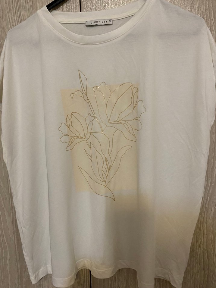 Krem rengi pamuklu kadın tişört, rahat bol kesim ve kısa kollu. Önünde minimal çiçek baskısı ve yuvarlak yaka bulunur. İki kol altı arası 61 ve boyu 58 cm