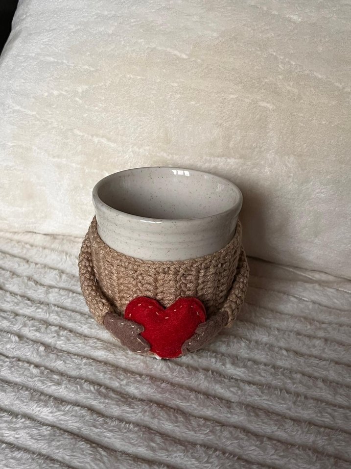 Krem renginde seramik kupa, örgü kılıf ve kırmızı kalp detaylı küçük kollarla süslenmiştir. ☕️sevgılıler günü için güzel hediye