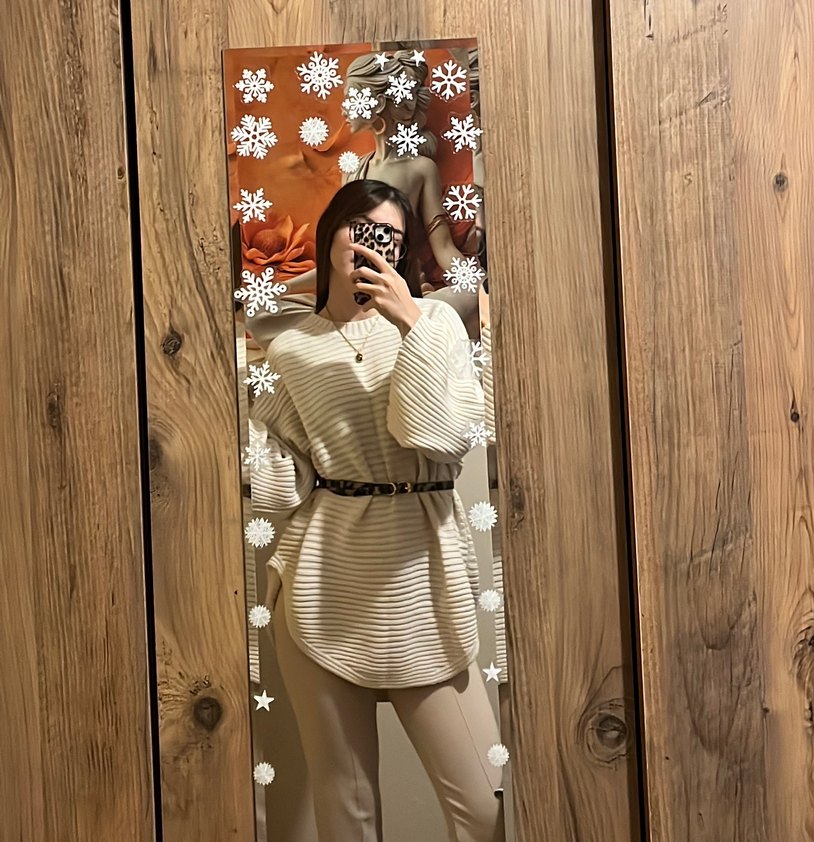 Krem, uzun kollu, bol kesim rahat kazak. kolları yarasa kol gibi oldukça geniş tesettüre de uygun bana oldukça bol geldiğinden ötürü kemer ile bağladım boy 170 ve kalçayı tamamen kapatıyor
