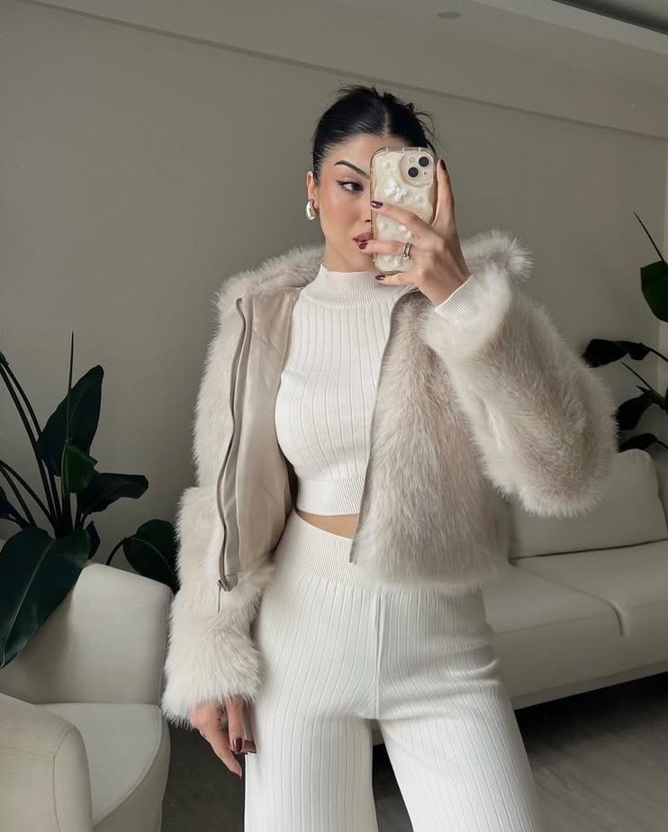 Krem rengi fermuar detay kürk ceket mont M beden mevcuttur