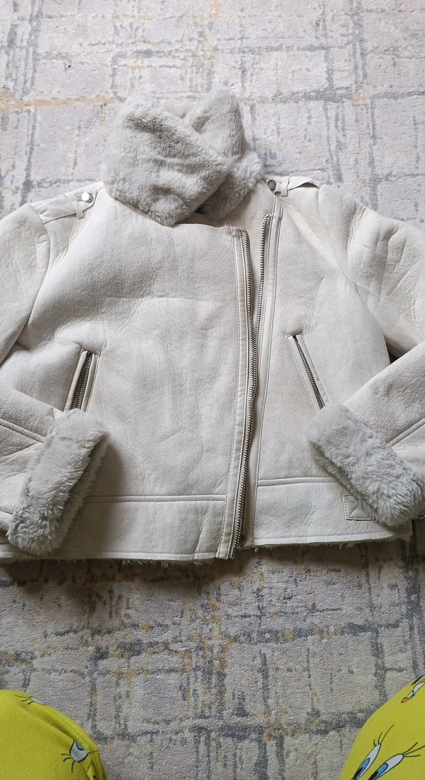 Bu dar kesim midi ceket, yakasında ve kollarında kürk detayları bulunan yumuşak ve sıcak kumaştan yapılmıştır. Düz krem rengi tasarımı günlük sokak stili için uygundur.