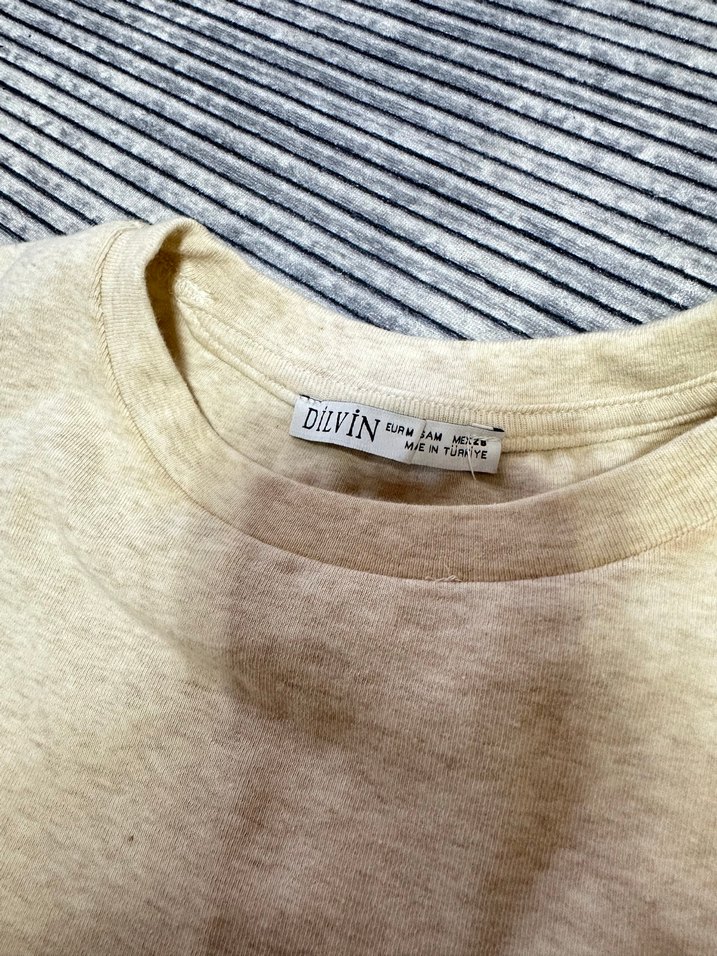 Bej renkte, pamuklu kumaştan yapılmış, kolsuz ve yuvarlak yaka crop.