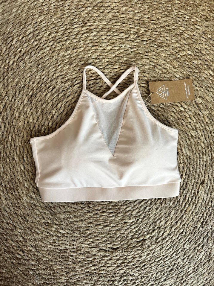 Krem rengi mini spor sütyeni, ince çapraz askılı, konforlu ve hafif destek sağlar. Etiketi üzerinde hiç giyilmemiş. Vayu marka.