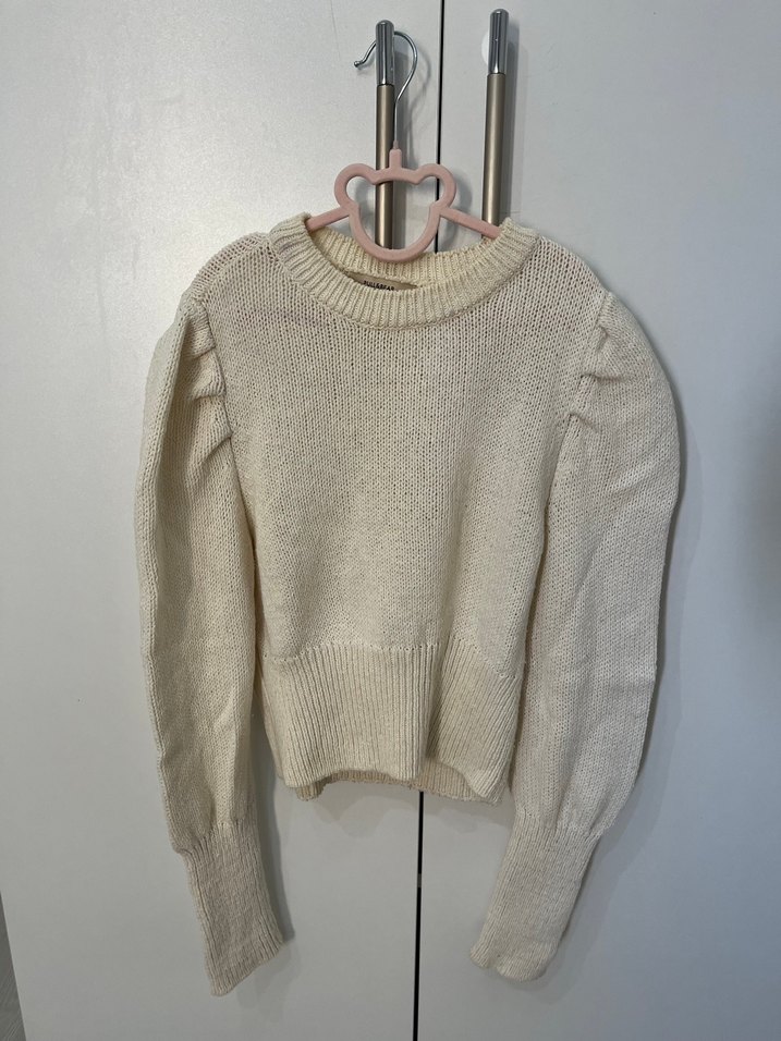 Krem rengi örgü kadın kazak, bisiklet yaka ve uzun kolludur. Rahat, desen içermeyen ve günlük kullanıma uygundur.