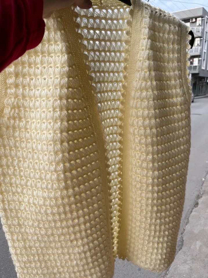 Krem renkte kolsuz, örme dokulu yelek, parlak bir görünüme ve midi boyda rahat bir şıklık sunar.