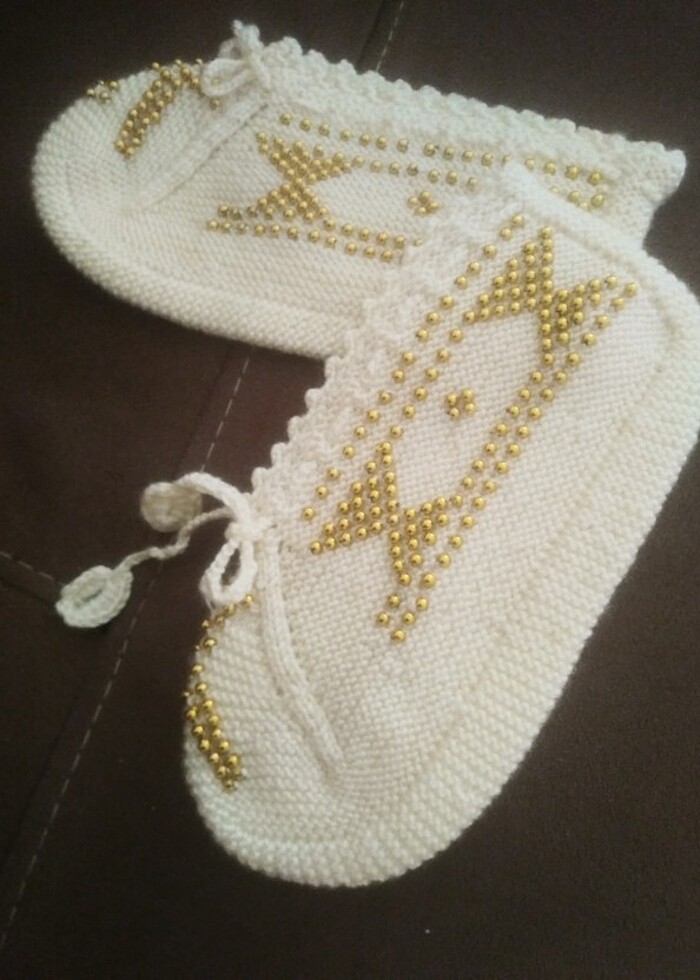 Şiş örgüsü boncuklu patik.Boncuklar sonradan işleme değil boncukla beraber örülmüştür.37-38 numara ayağa uygundur. Hiç kullanılmamıştır.tam çeyizlik