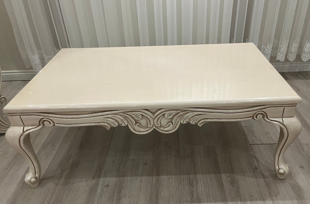 Krem rengi oyma süslemelerle zarif detaylara sahip, pürüzsüz yüzeyli ve klasik tasarımlı gerçek ağaç mobilyadır üzeri lake boyalıdır hafif vurkları vardır