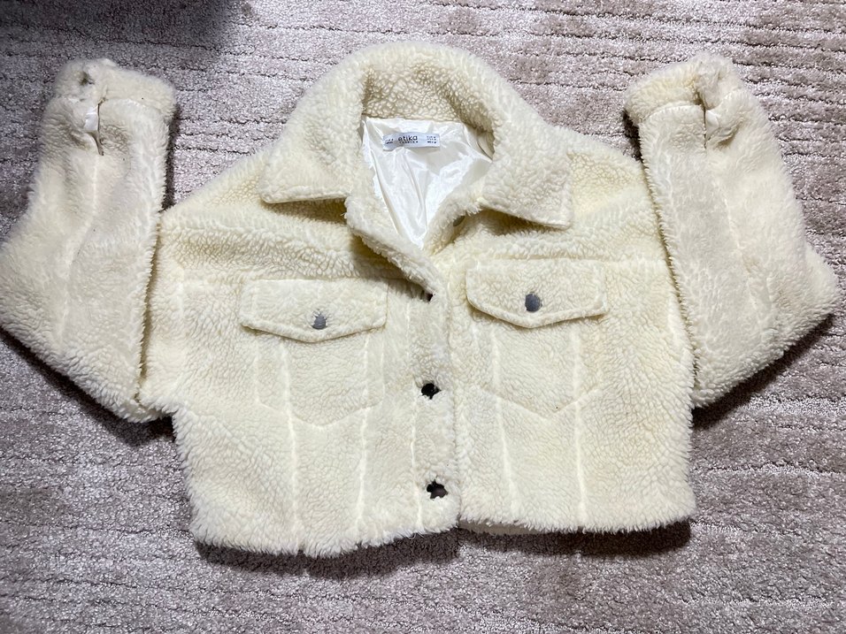 Krem rengi peluş kumaştan, peluş detaylı, notched lapel yaka ve cep detaylı, uzun kollu, rahat kesim midi kadın ceketi. Günlük sokak stili için uygun.