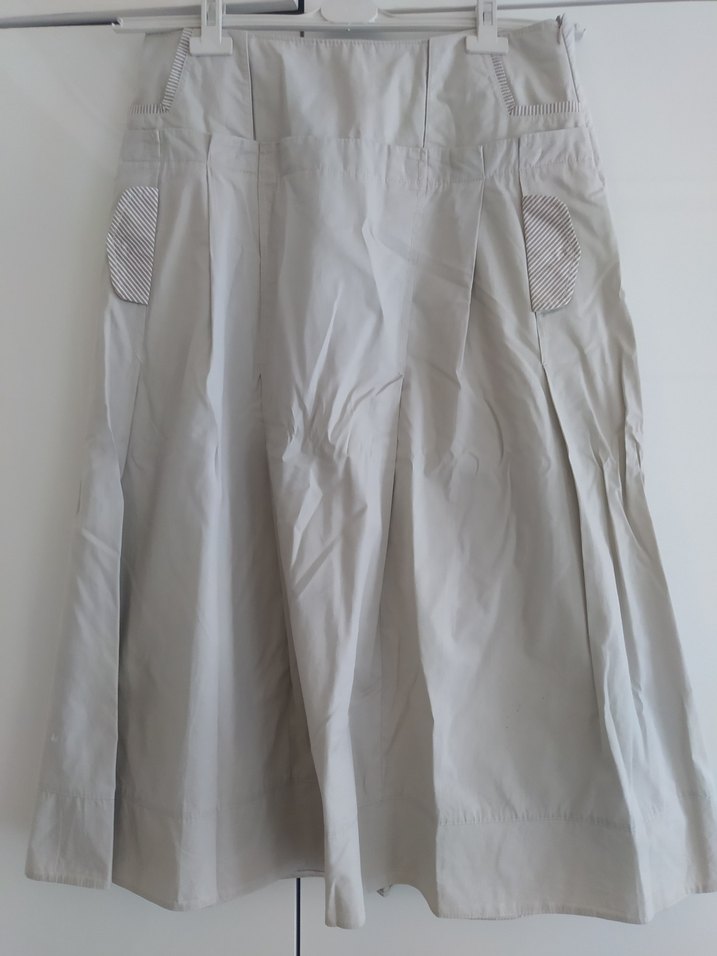 Krem renkte, keten kumaştan üretilmiş, pilili ve bol kesim midi etek. Minimal deseni ve rahat yapısıyla dış mekan kullanımı için uygundur.