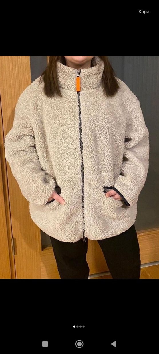 krem renkte, uzun kollu, yüksek yakalı, bol kesim ve midi boy kadın ceketi. Yumuşak, sıcak kumaştan tüylü detaylara sahip, günlük sokak modasına uygun.